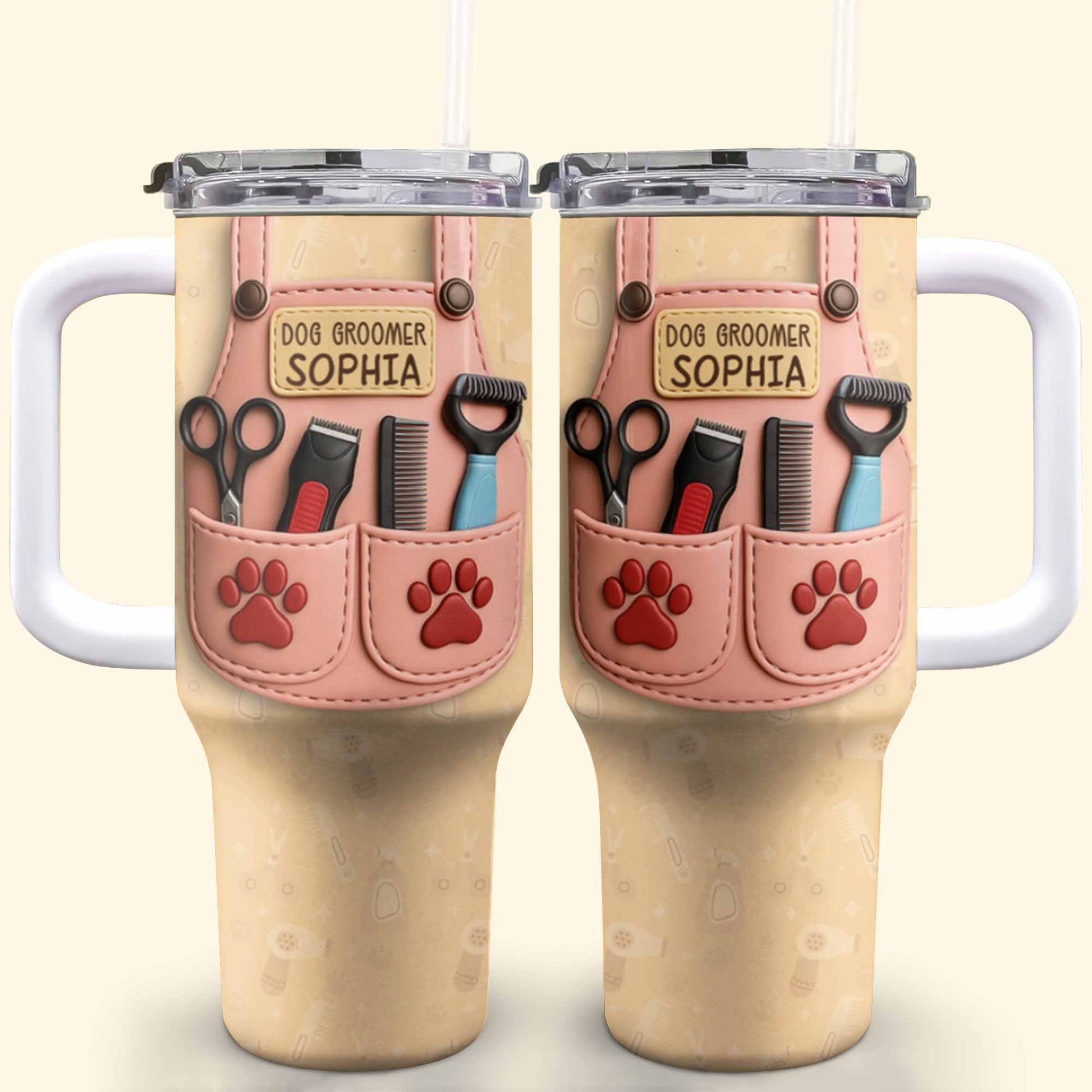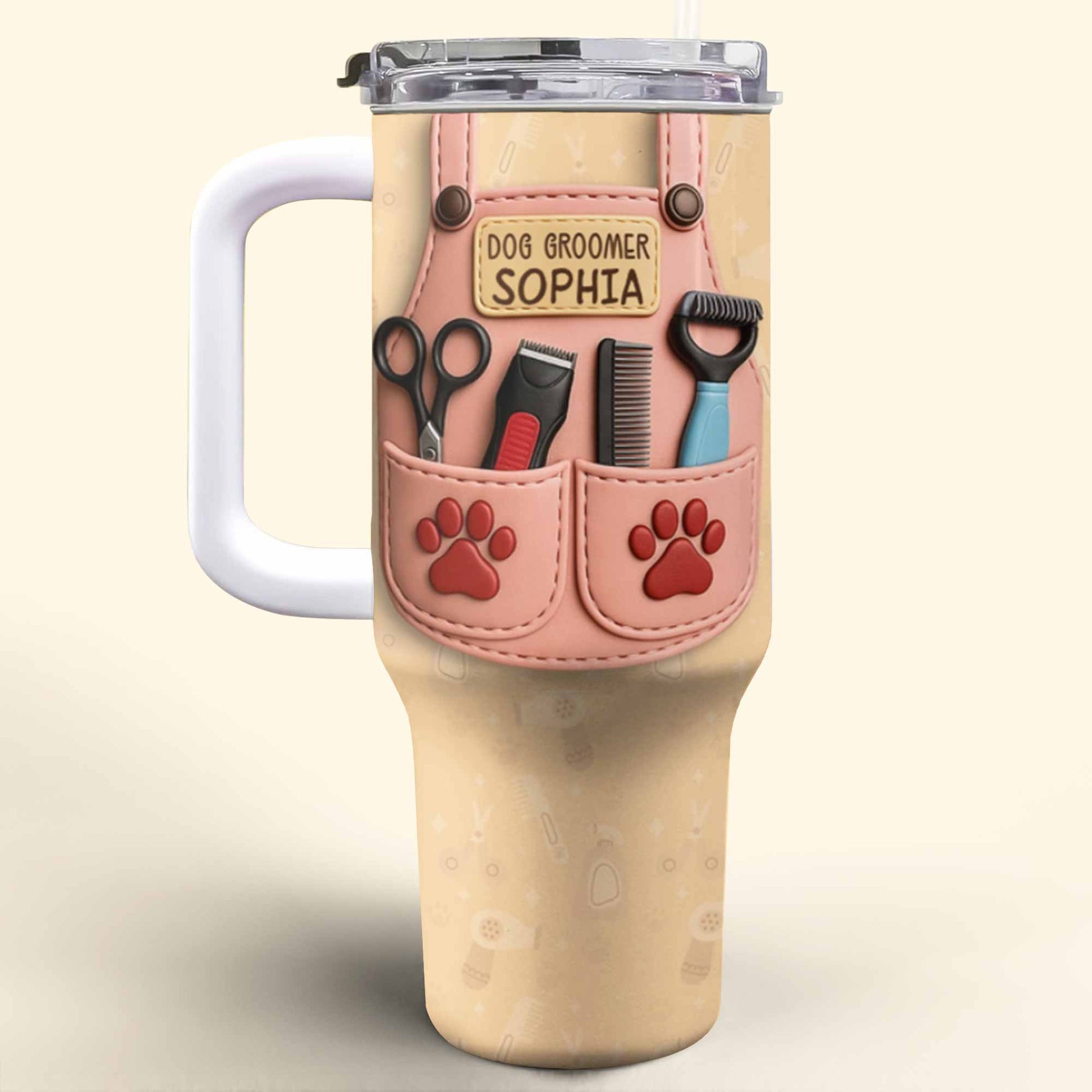 Regalo para peluquero canino con herramientas de aseo y huellas de patas - Vaso personalizado de 40 oz con pajita - DOG063_TBS