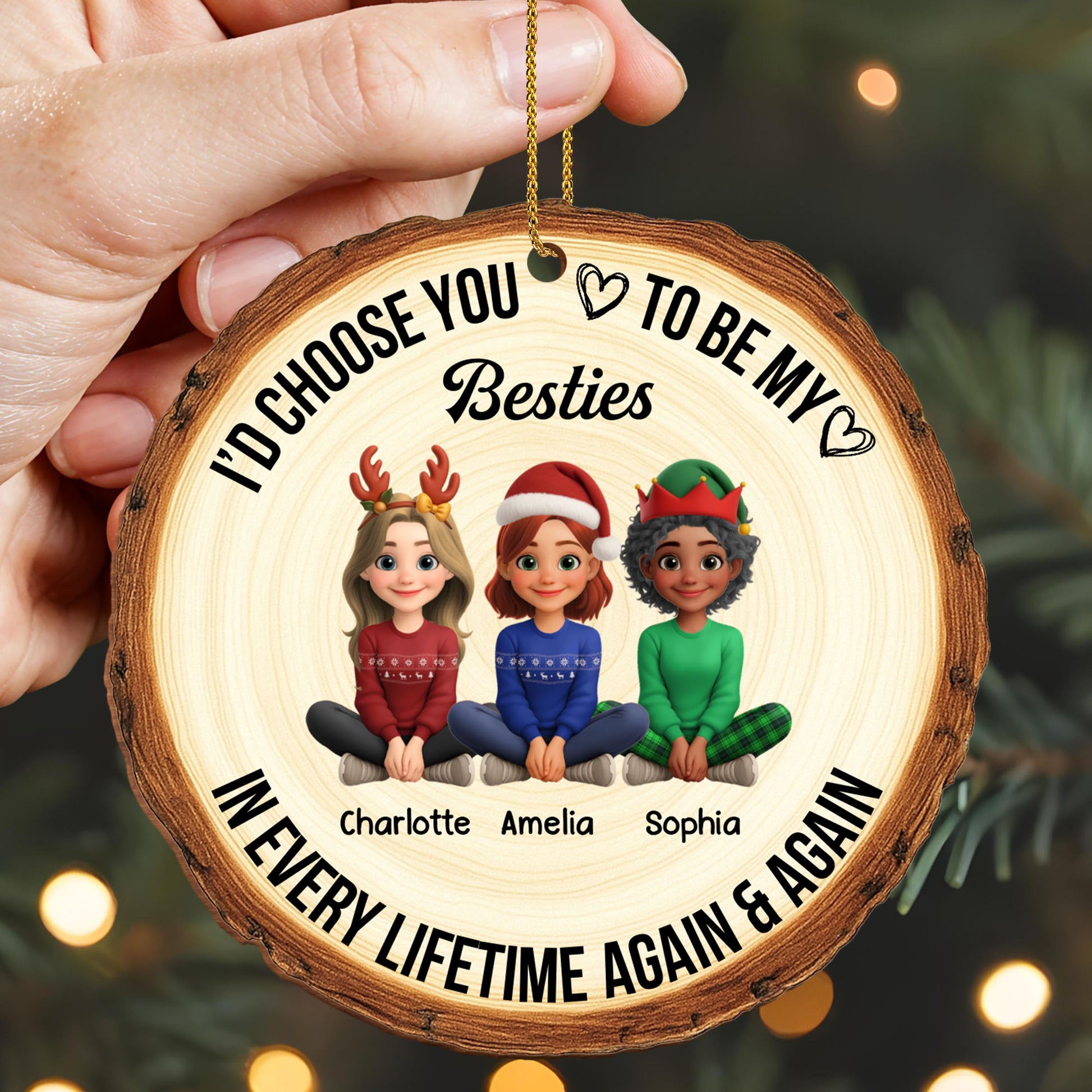 Message: I'd Choose You To Be My Bestie In Every Lifetime Again And AgainNote: Due to differences in monitor settings and lighting, the actual color may vary slightly. This is a printed wood ornament with a faux 3D effect that adds depth and a premium finish.