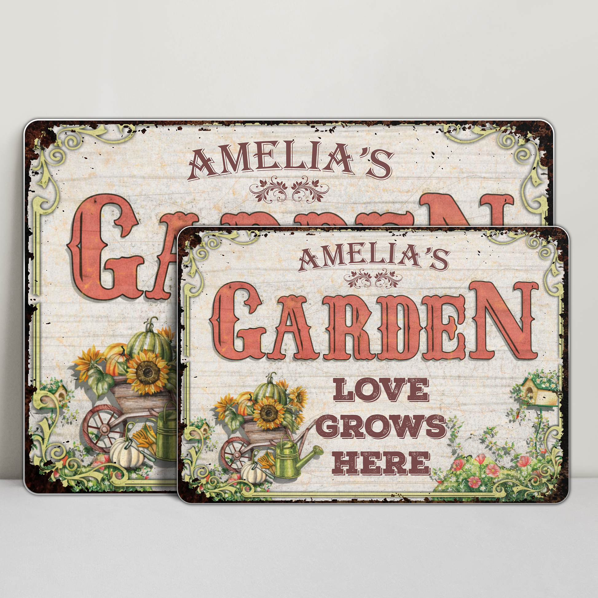 Love Grows Here With Sunflowers And Wheelbarrow - Personalized Metal Sign - GAR021_MSIGN