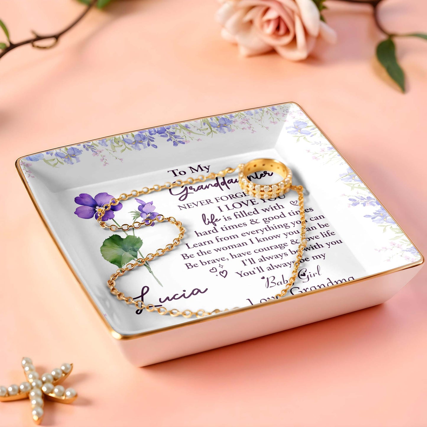 To My Granddaughter, Never Forget That I Love You, Flowers - Personalized Custom Jewelry Dish, Ceramic Dish, Square Shape - GDT387_SCRF