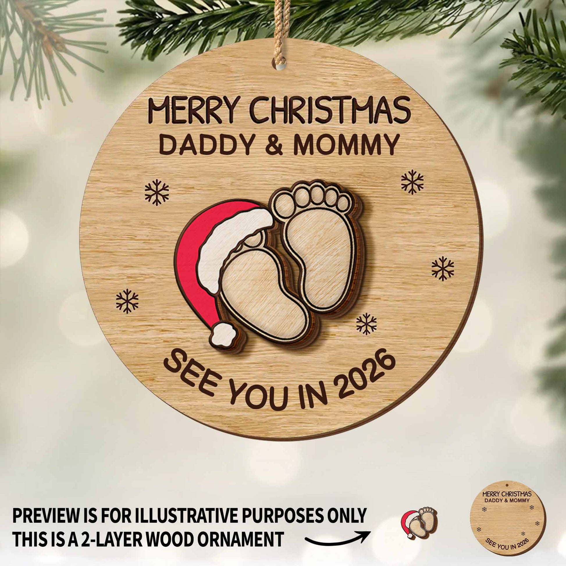 Merry Christmas Daddy & Mommy, Baby Feet With Santa Hat, Personalized Wood Ornament, Gift For Expectant Parents