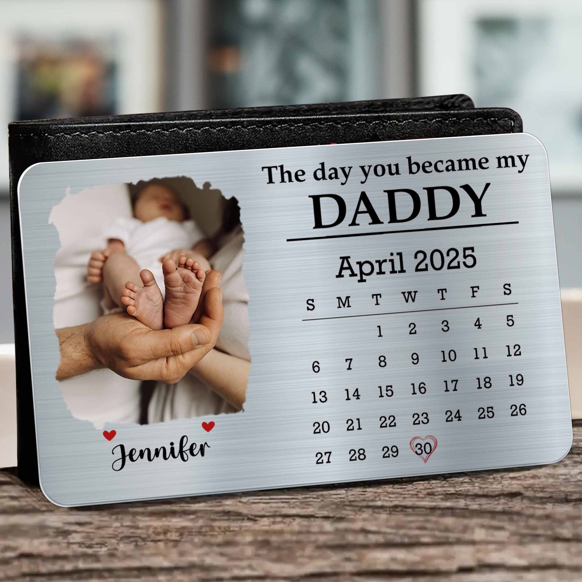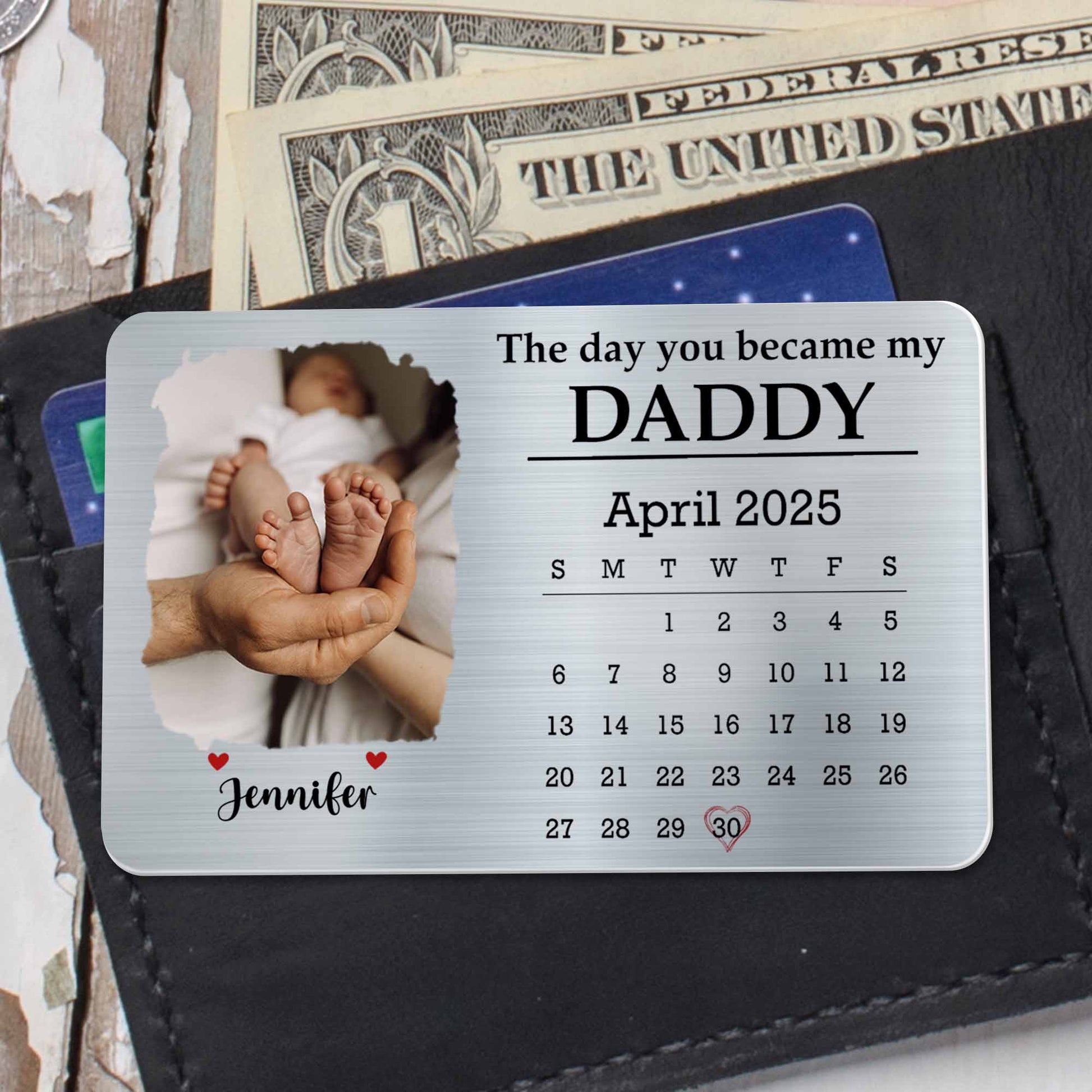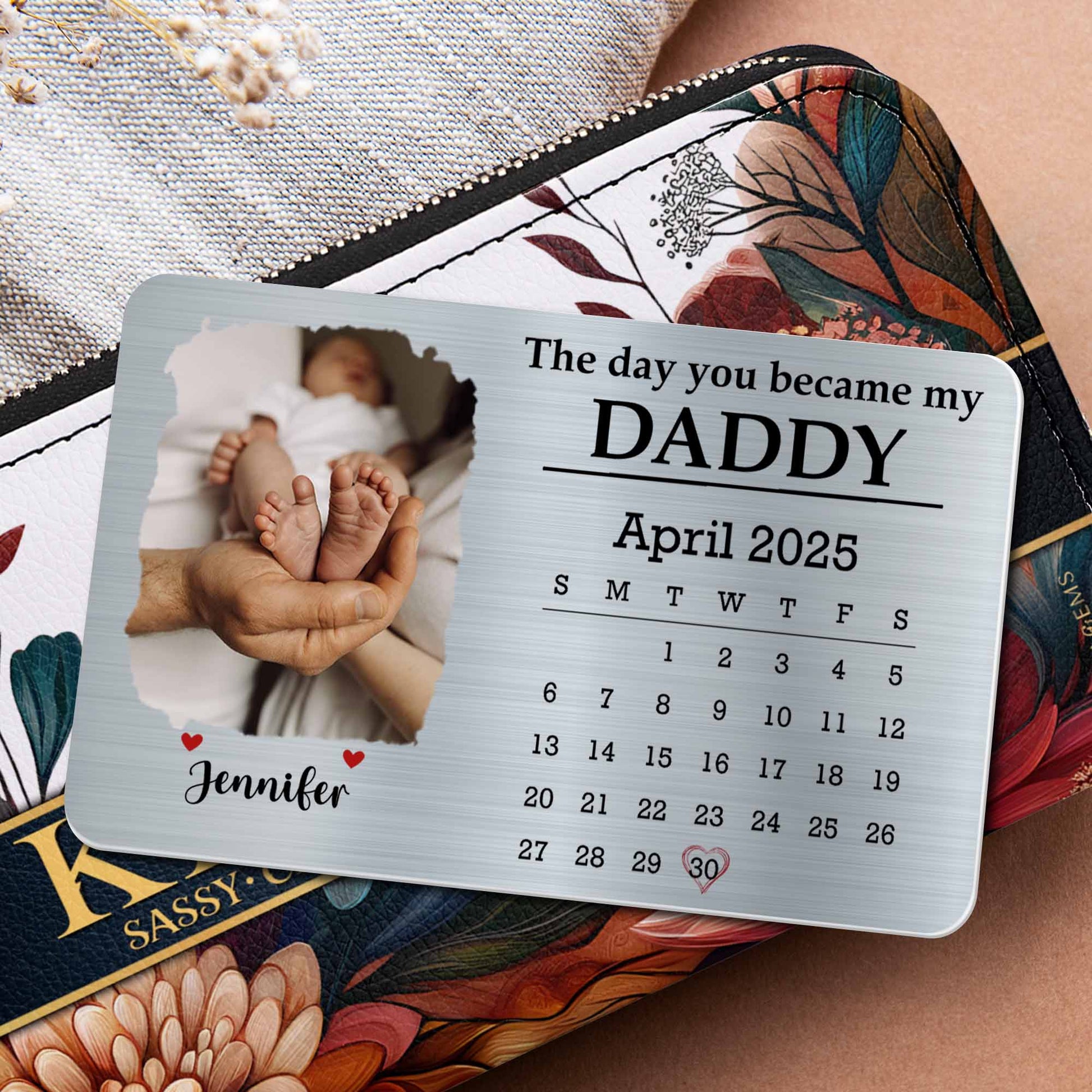 The Day You Became My Daddy, Baby Feet and Calendar Design, Personalized Aluminum Wallet Card, Gift For New Fathers