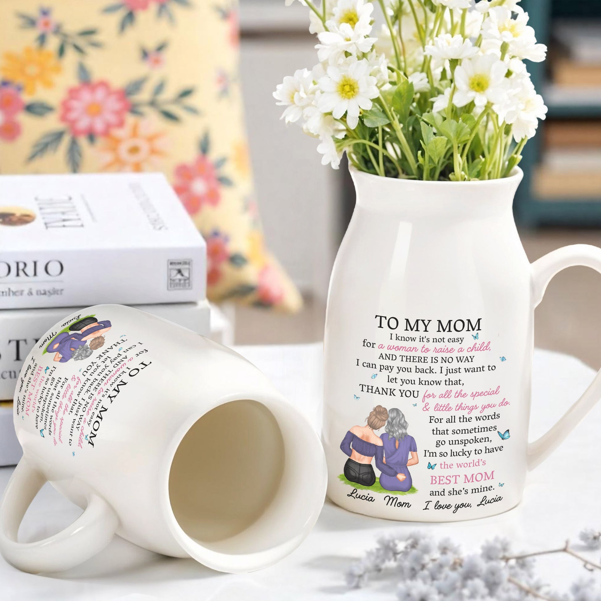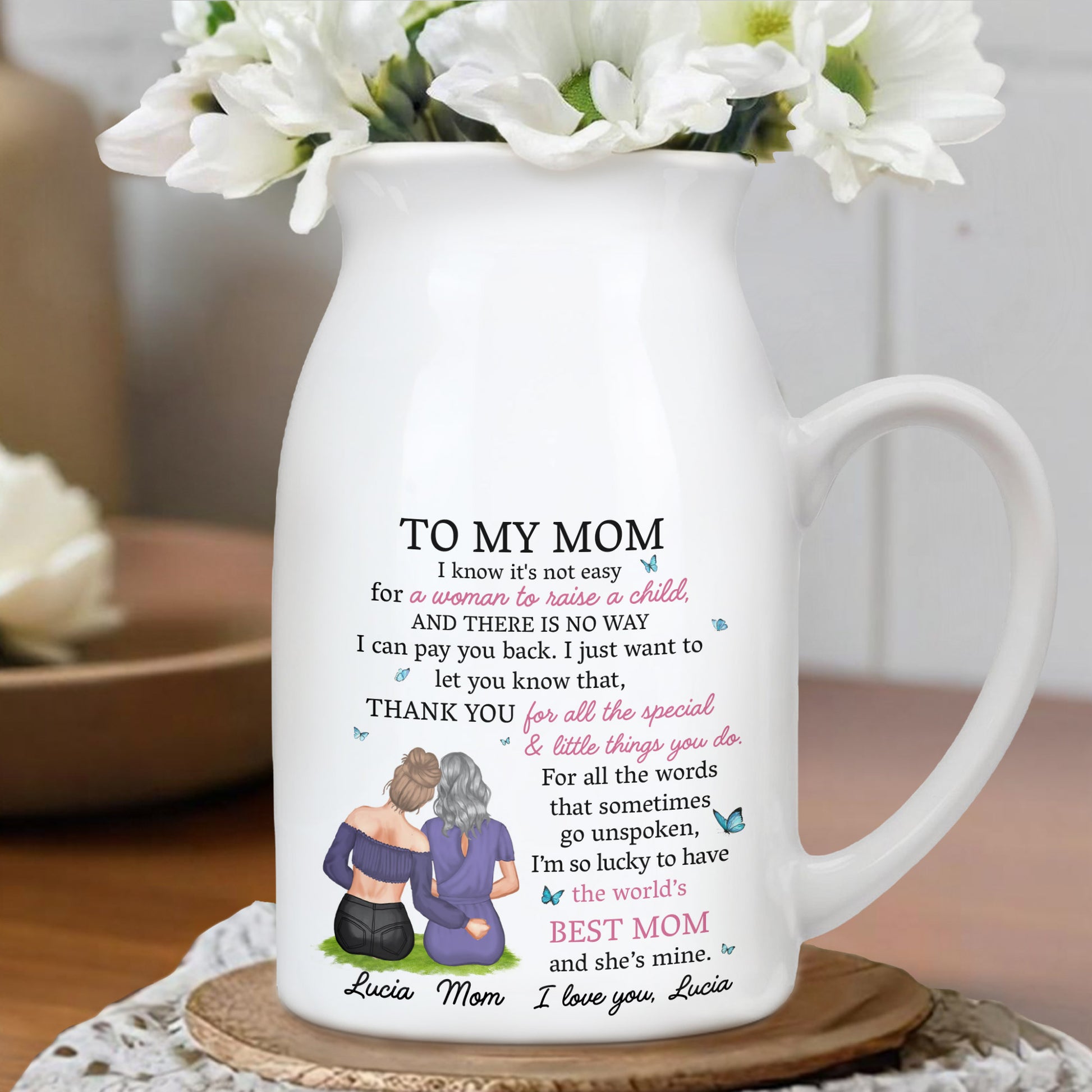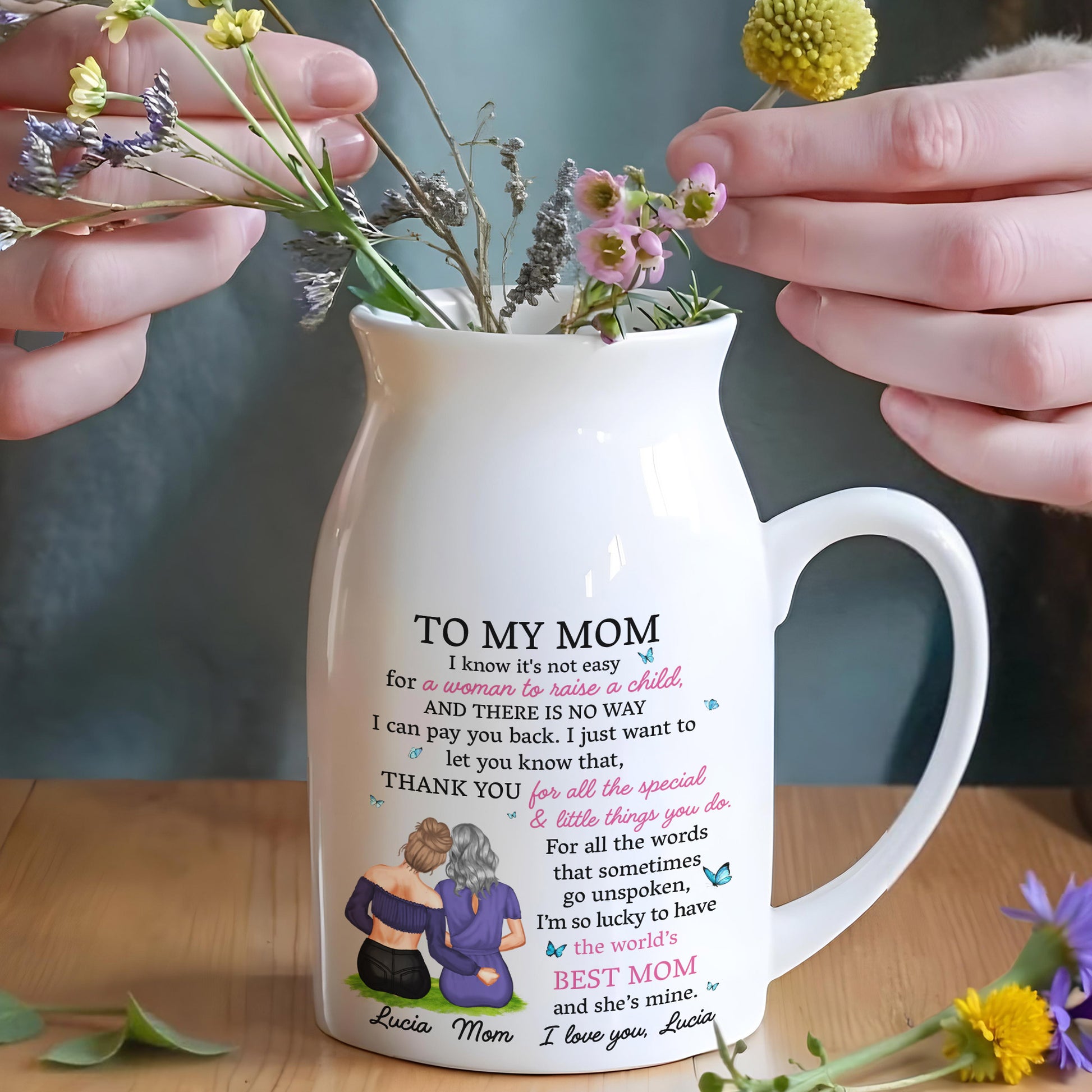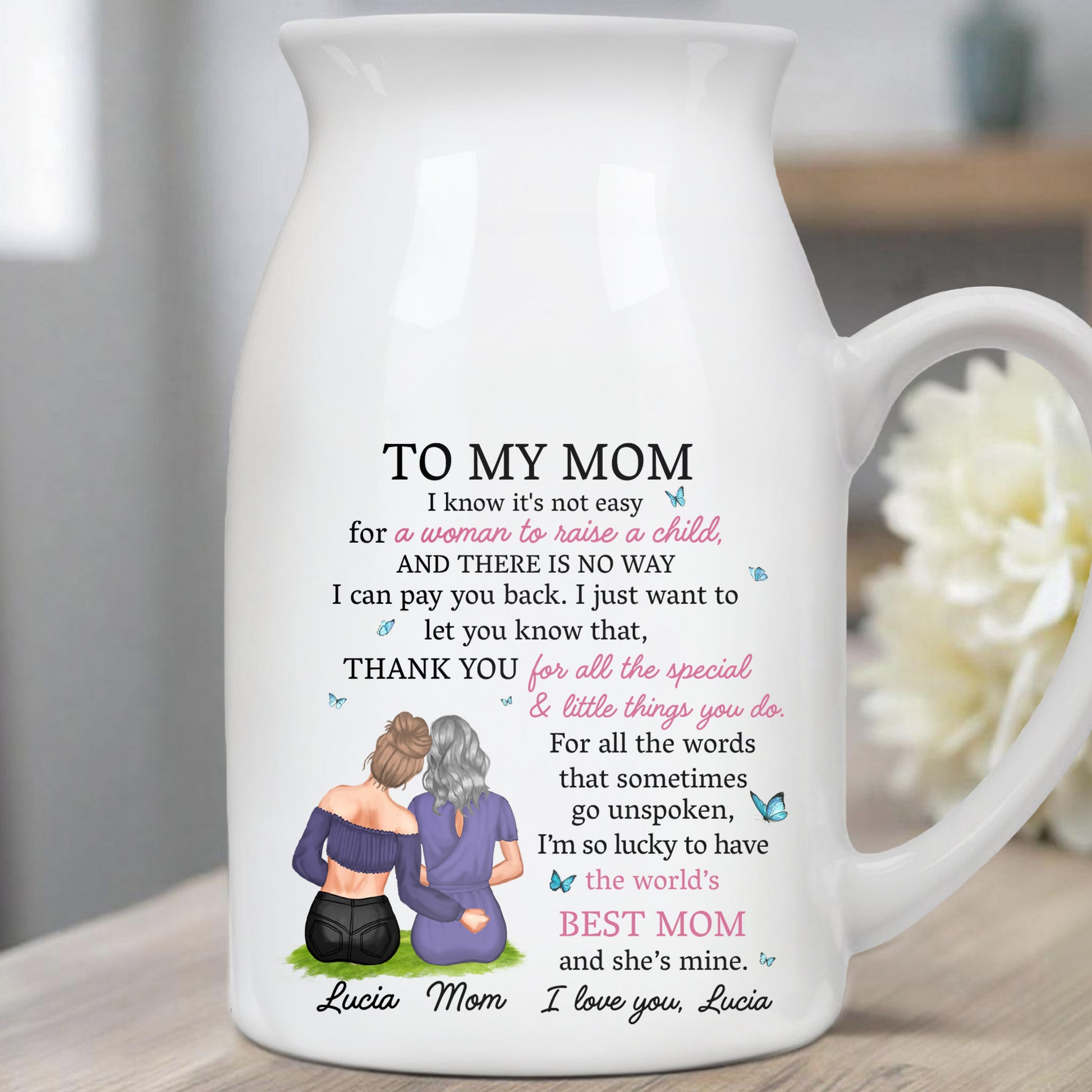 Je sais que ce n'est pas facile pour une femme d'élever un enfant, mère et fille enlacées - Vase à fleurs en céramique personnalisé - MOM067_CEV
