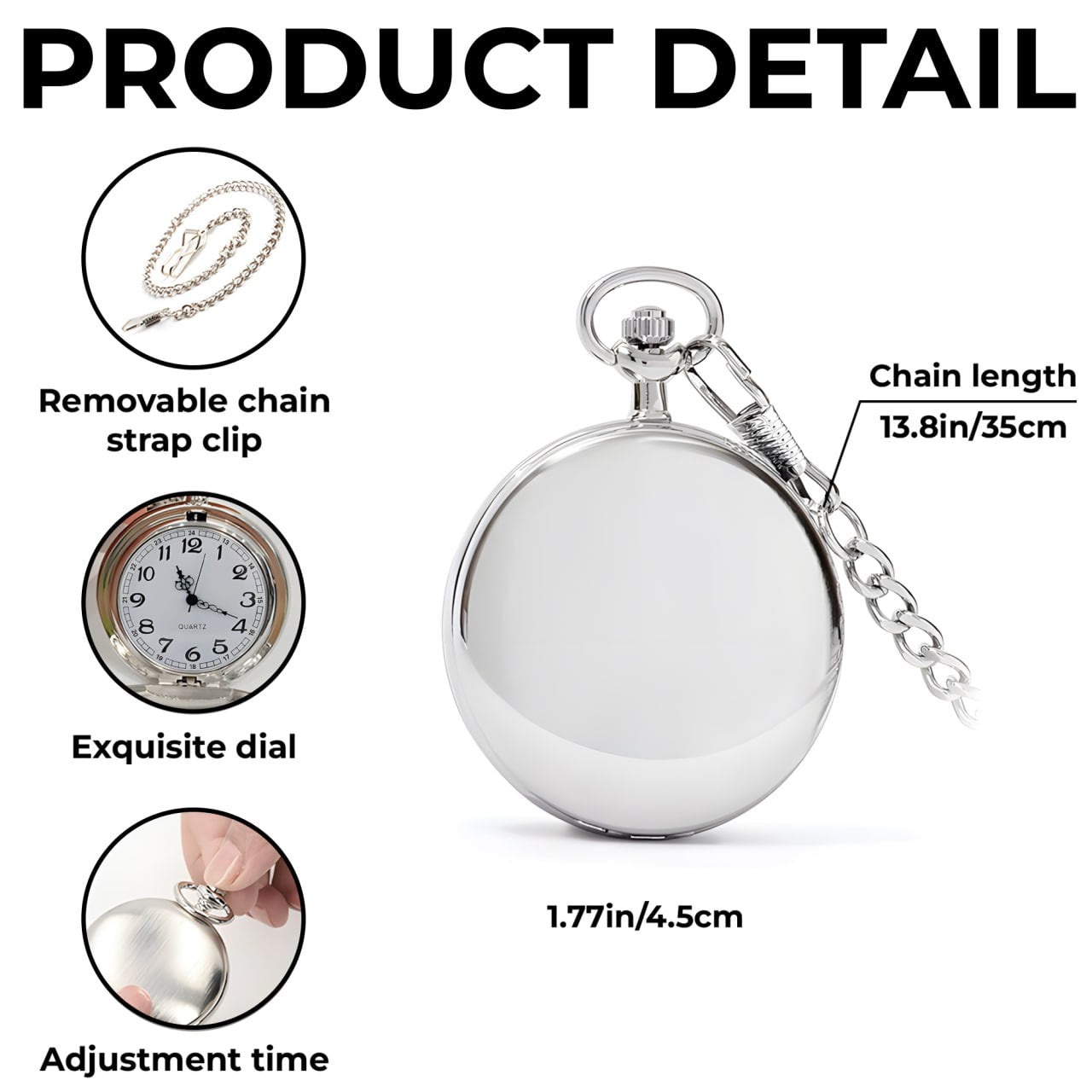 Adoptez une élégance intemporelle avec notre montre de poche personnalisée . Dotée d'un boîtier rond d'inspiration vintage, d'une finition polie et lisse et d'une chaîne amovible, cet accessoire plaqué argent est un souvenir raffiné pour les mariages, les anniversaires, les départs à la retraite ou pour un look décontracté.