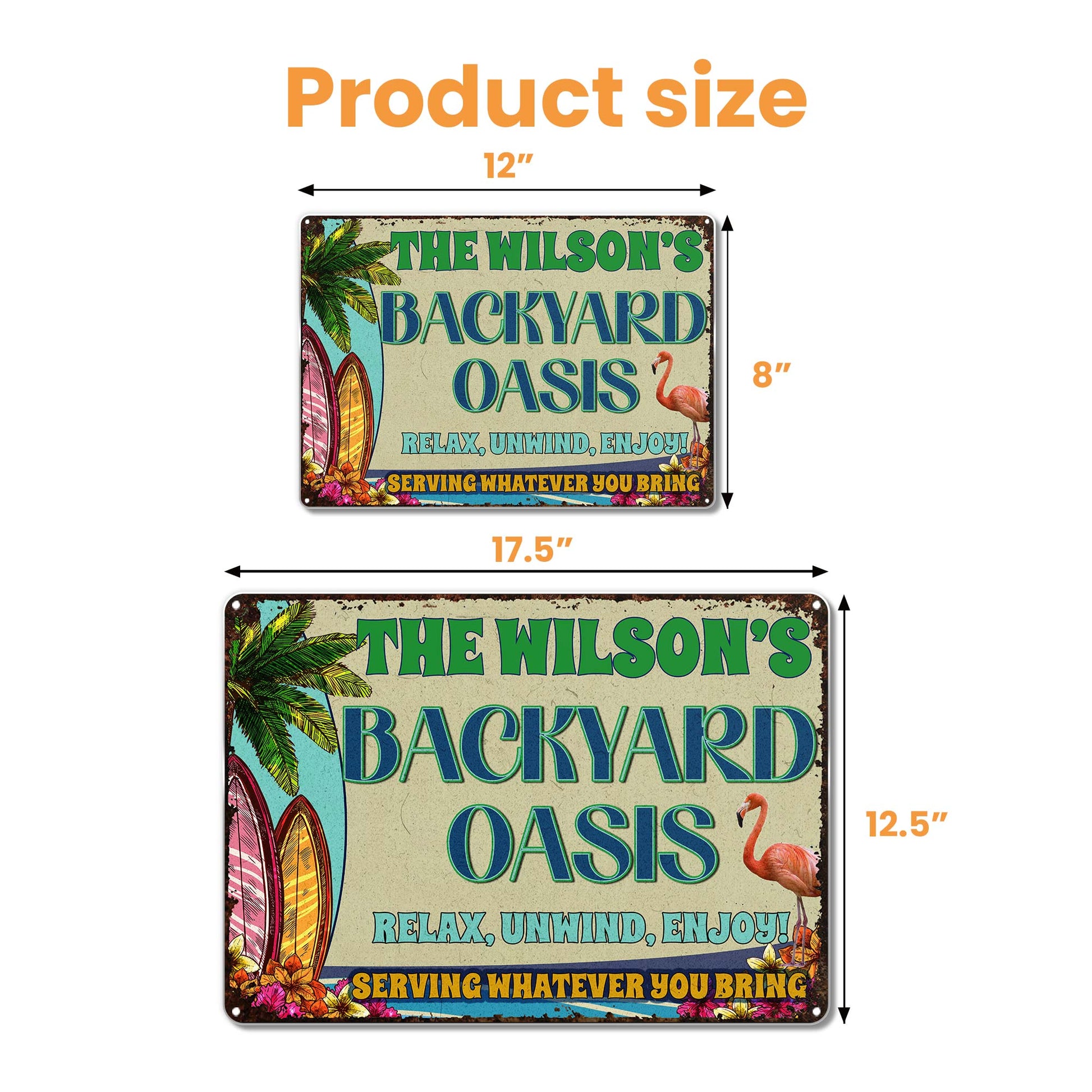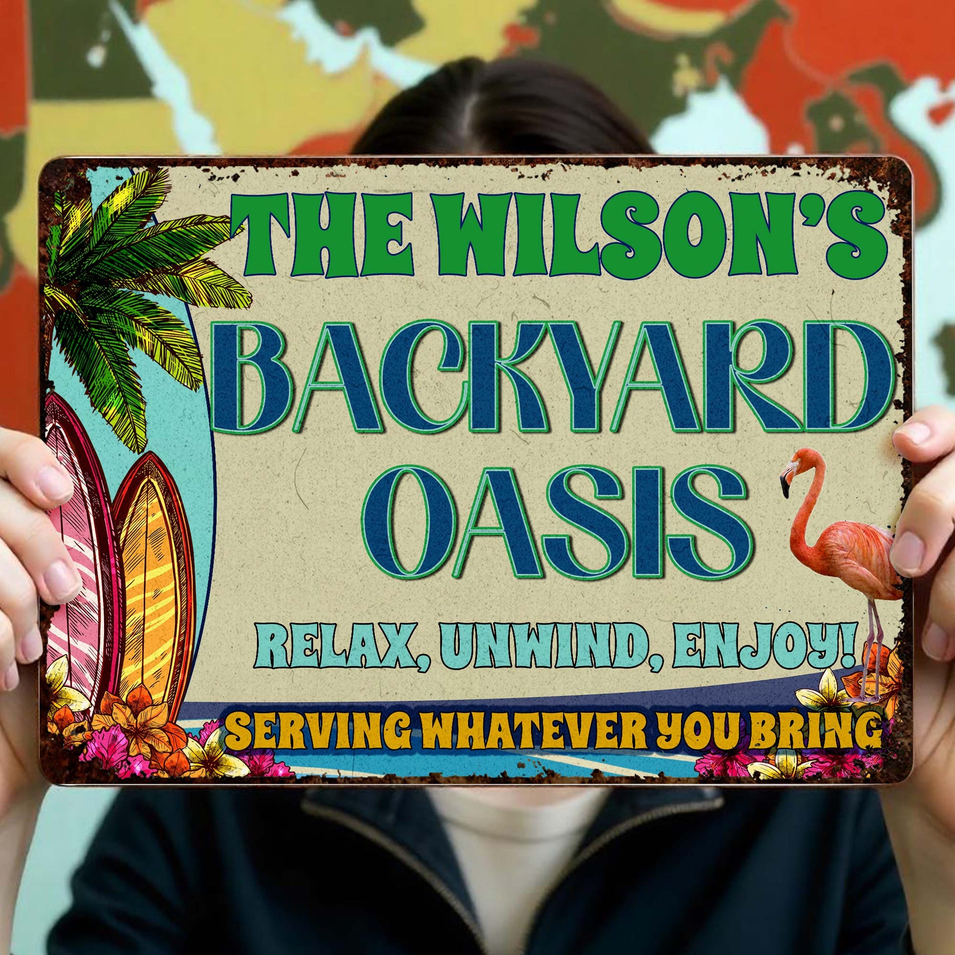 Backyard Oasis With Palm Tree, Surfboard, And Flamingo, Personalized Metal Sign, Gift For Home Owners