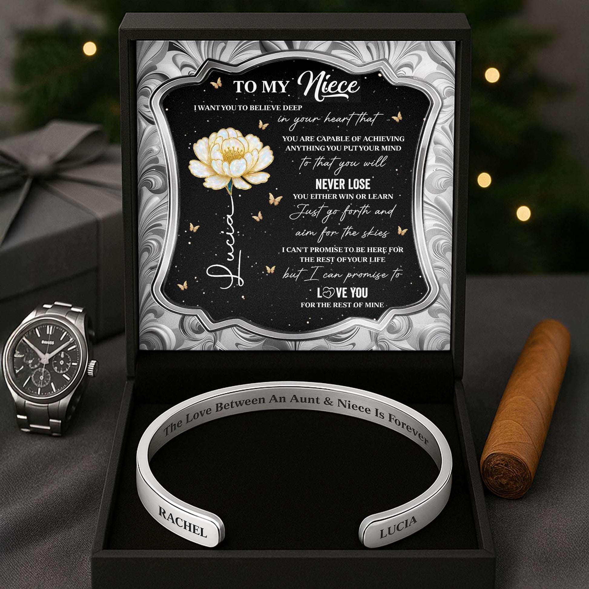 To My Niece, The Love Between An Aunt & Niece, Flower - Personalized Bracelet Cuff With Custom Message Card - NCE002_CUFB