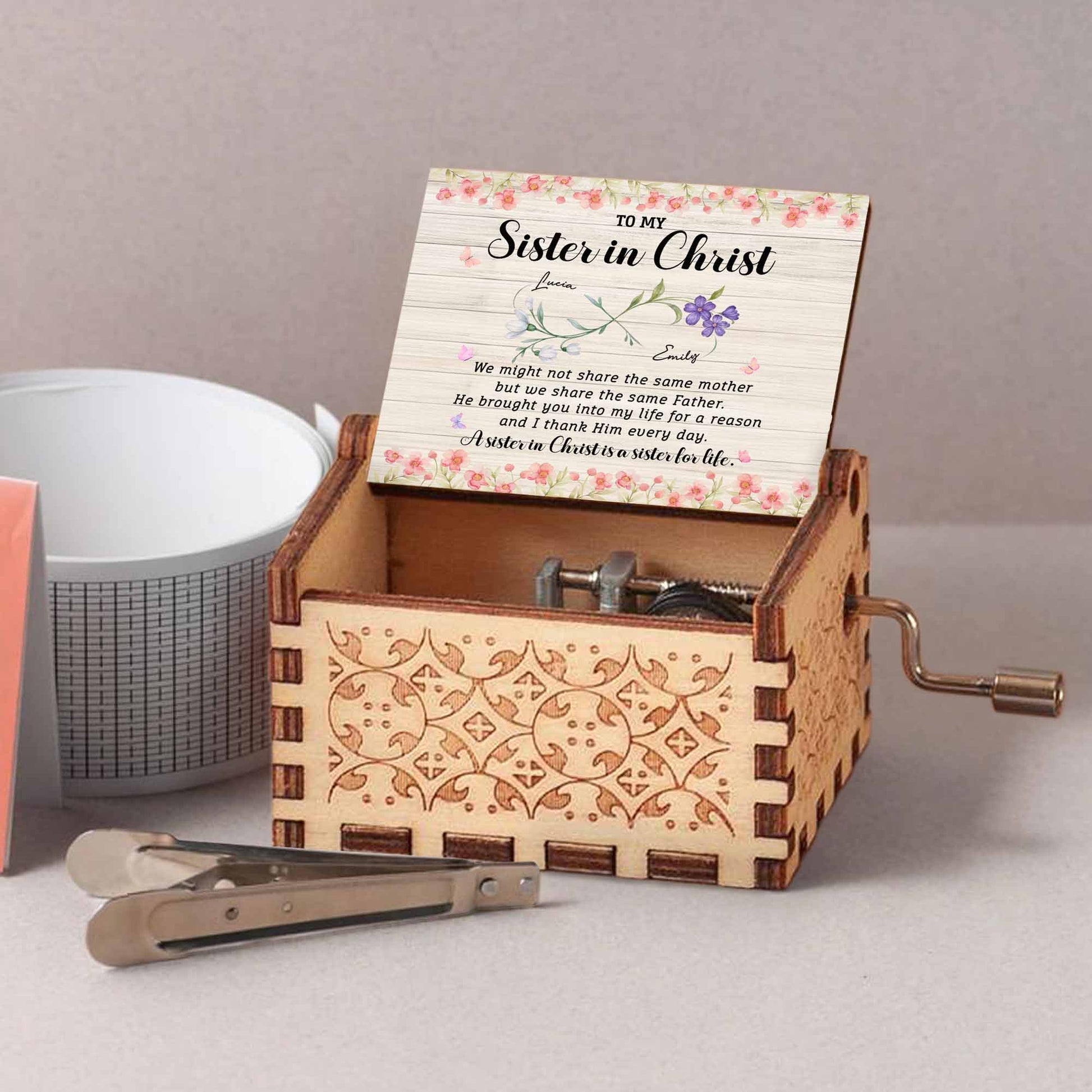 To My Sister In Christ, Flowers And Butterfly Design, Custom Music Box, Gift For Spiritual Friends