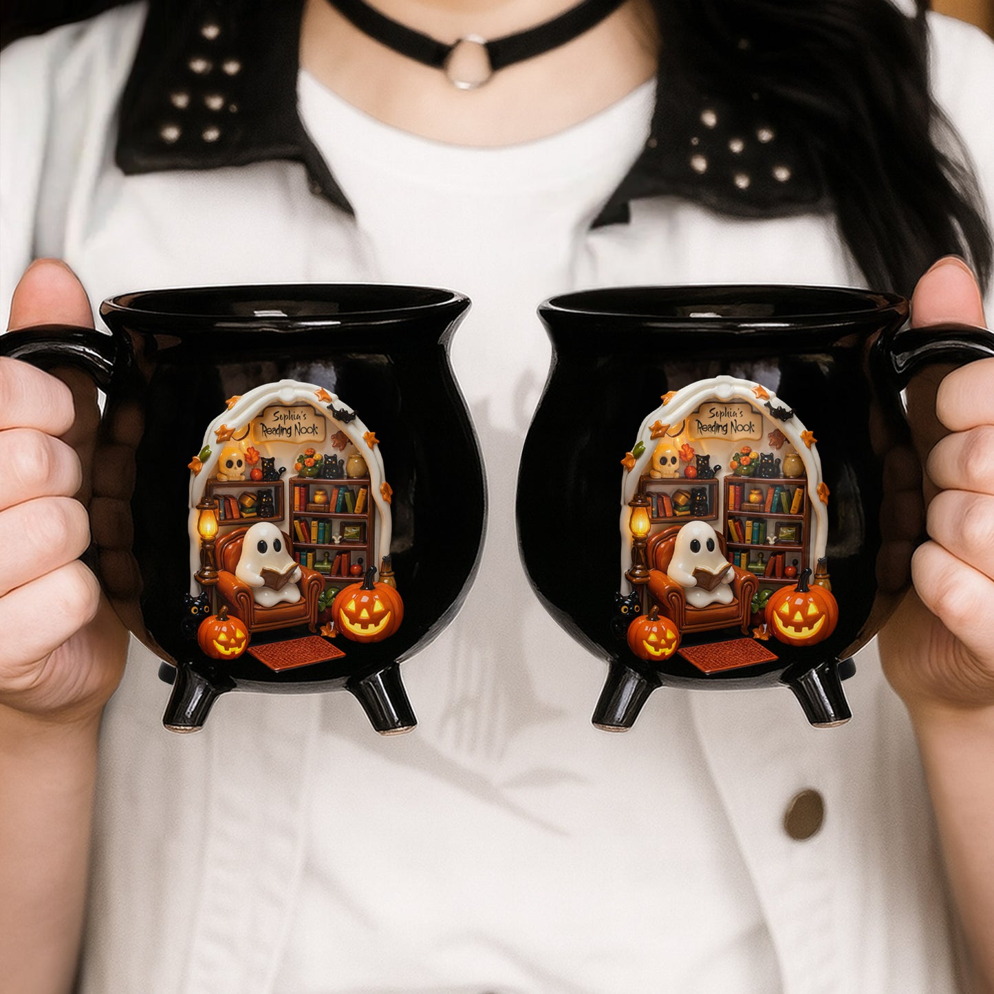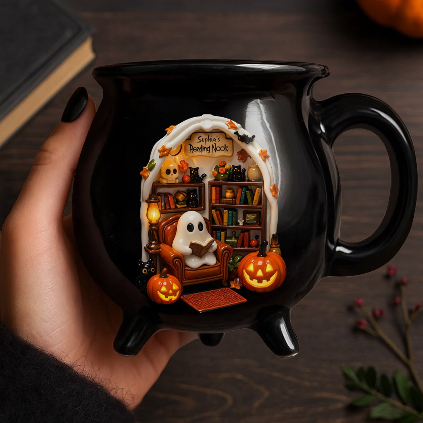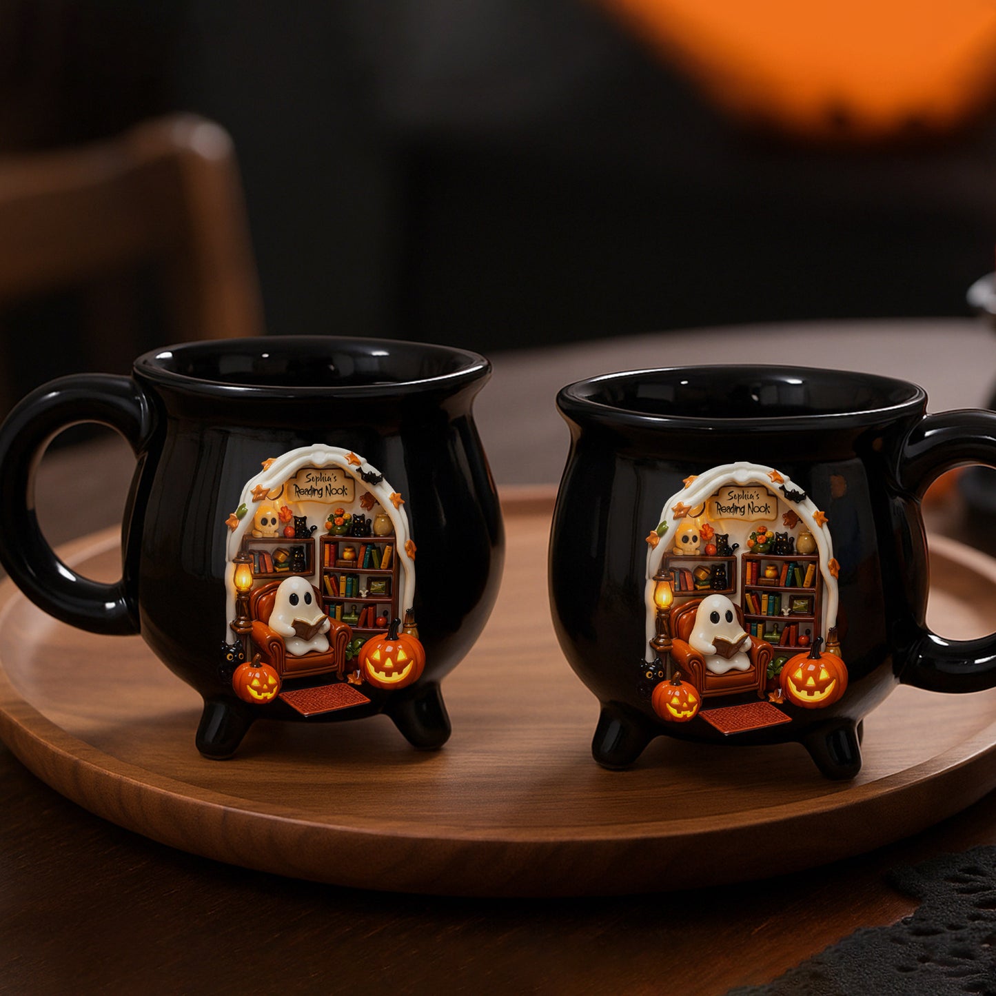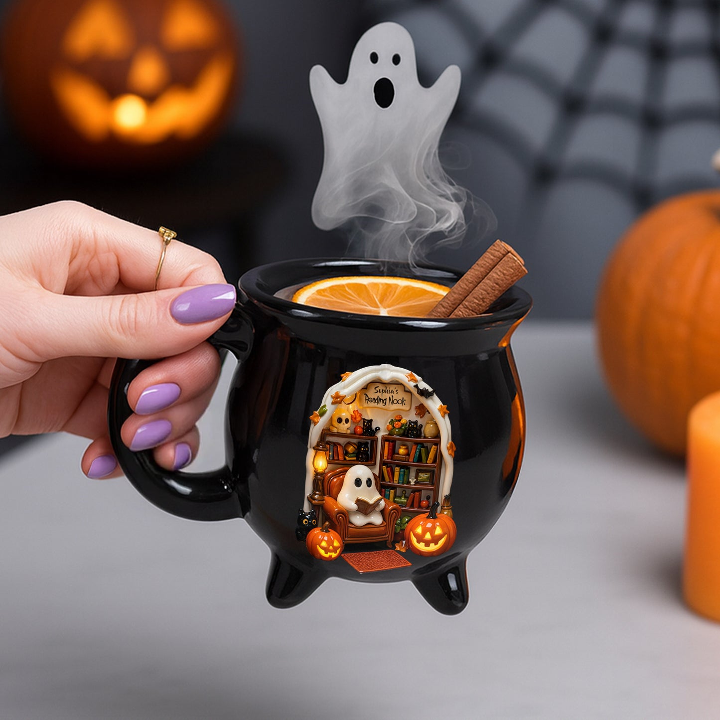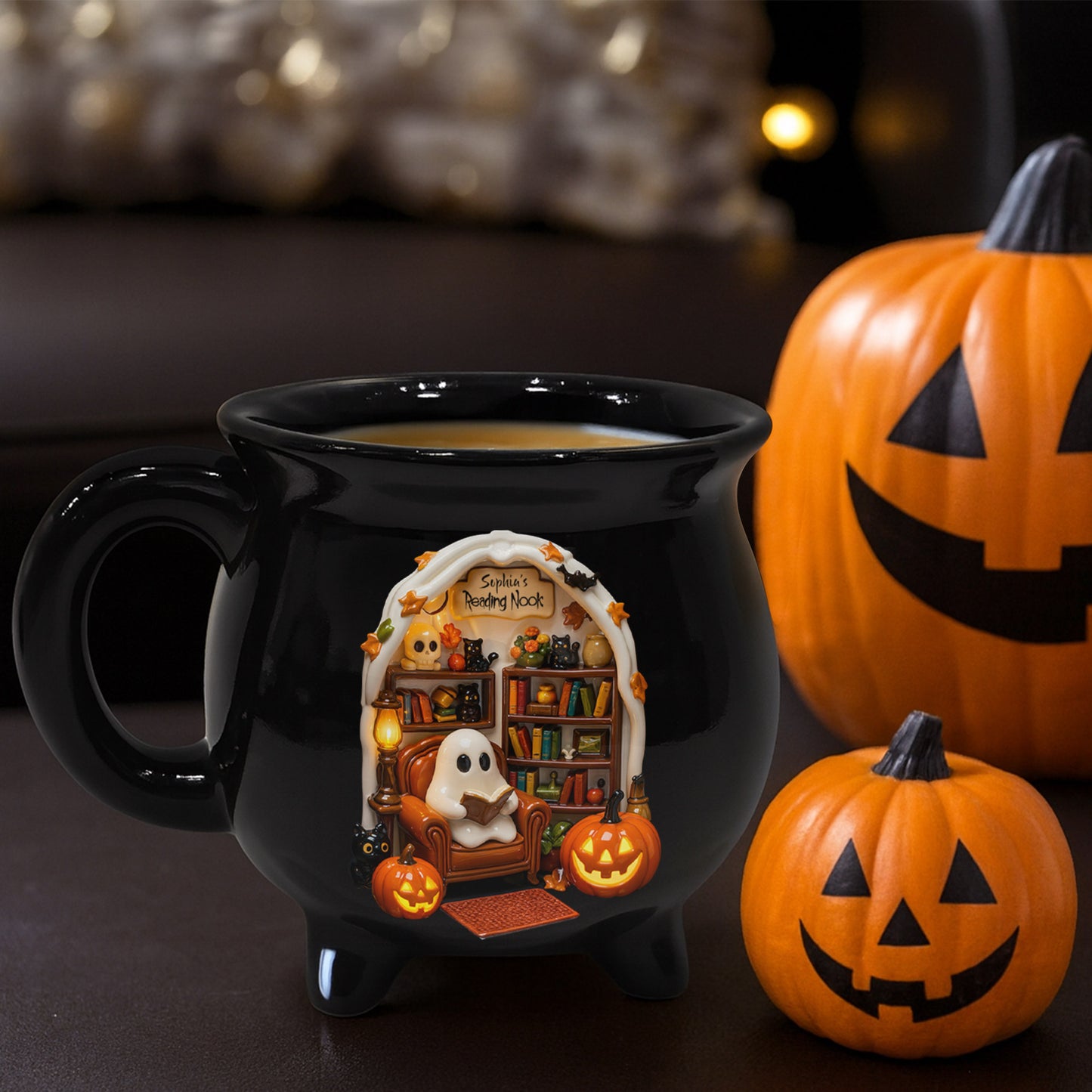 Sophia's Reading Nook Ghost and Pumpkins Design,Ceramic Cauldron Coffee Mug,Gift For Book Lovers